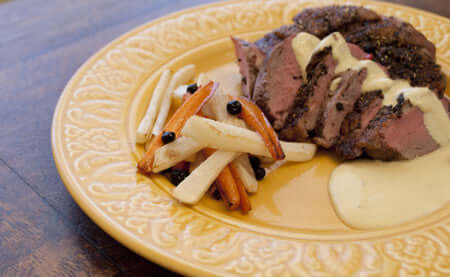 Is the cold weather making you crave some delicious duck? We've got you covered with this recipe for Dijon Duck Breast. Duck is a popular meat in many cultures and is often overlooked here in the US. It has a flavor profile much more complex than chicken or turkey and leans a bit towards steak in texture. Rendered fat from cooking duck also makes for fantastic cooking grease. To keep this dish casual and tasty, we've sauteéd root vegetables to serve along side. Typically you will want to pair Duck with red wine, however you have mustard sauce, which needs a wine with some matching acidity. You'll want to pair this Burgundian inspired sauce with a light to medium bodied Pinot Noir from Burgundy or Oregon.